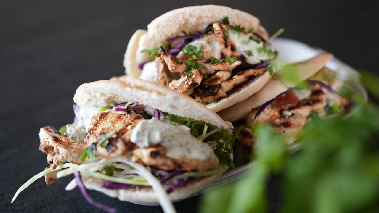- Garnir les pains pitas d'une base de salade, de crudités, de sauce au yaourt et de poulet grillé.